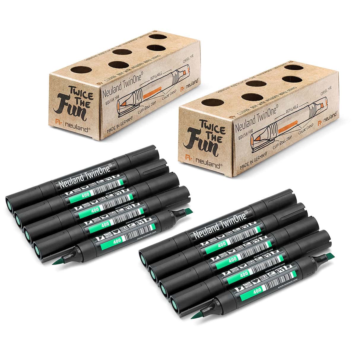 Die meistverwendeten Farben in Workshops sind nach wie vor schwarz, rot, blau und grün. Daher bieten wir den Neuland TwinOne® mit Keilspitze- und Pinselspitze genau in diesen Farben auch im praktischen 10er Set an.