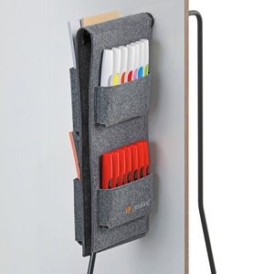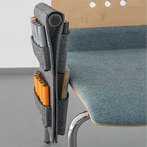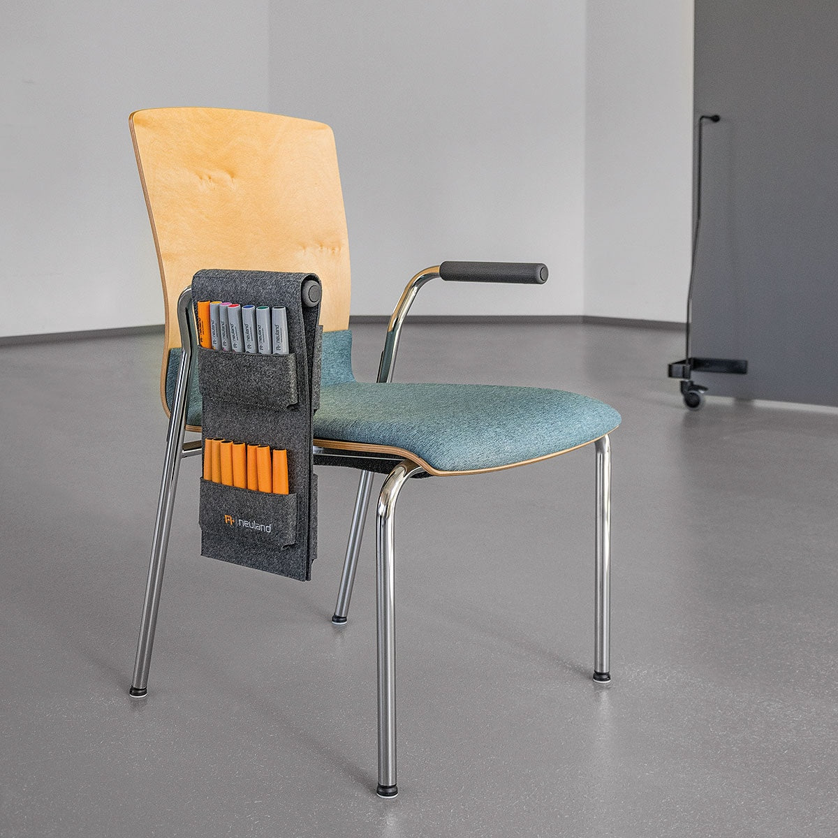 Ihren Namen verdankt diese Tasche der sattelförmigen Gestaltung. So kann sie – einem Sattel gleich – auf die Griffe der Neuland Werkwand® aufgesetzt werden. Die in den Wangen der Tasche eingearbeiteten Magnete sorgen für den sicheren Halt. Das funktioniert auch bei Pinnwänden und FlipCharts sowie an den Armlehnen von Stühlen. Dank der Materialsteifigkeit des Filzes kann die Satteltasche auch frei auf dem Tisch stehen.